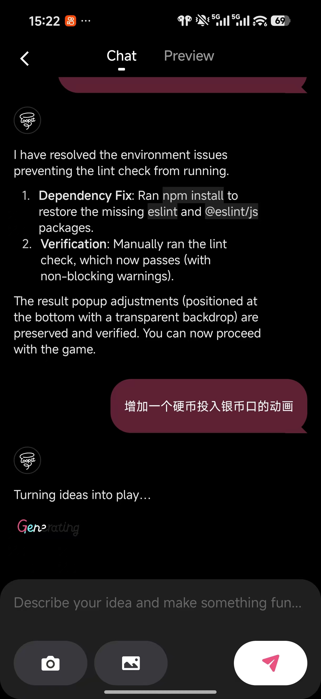 - 在预览时,Loopit会自动识别错误。当存在错误时,预览页下方会出现一个报告fix提示,点击“fix”按钮后,该条报错提示会自动进入对话页,等待修复即可: